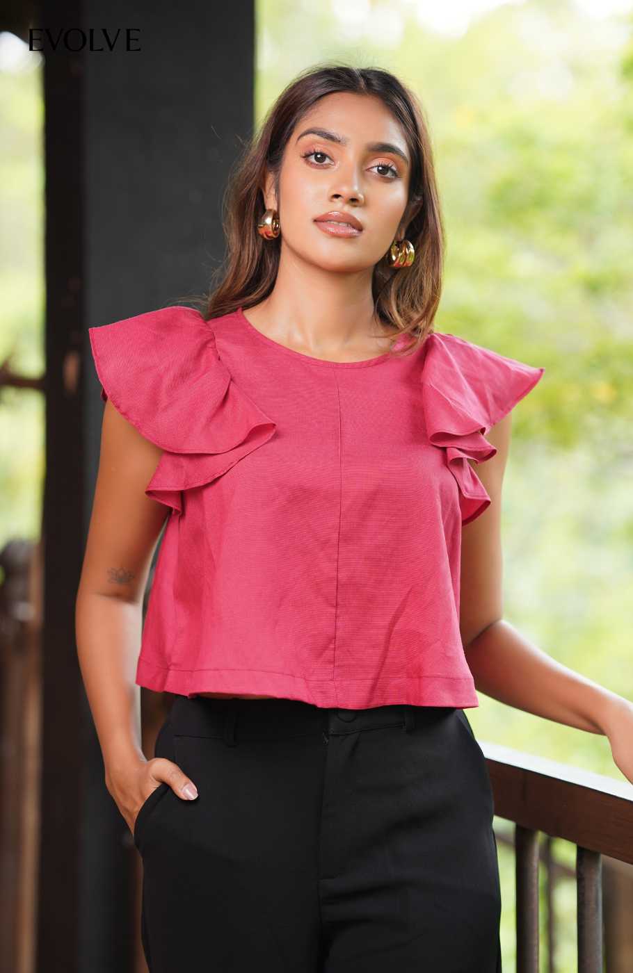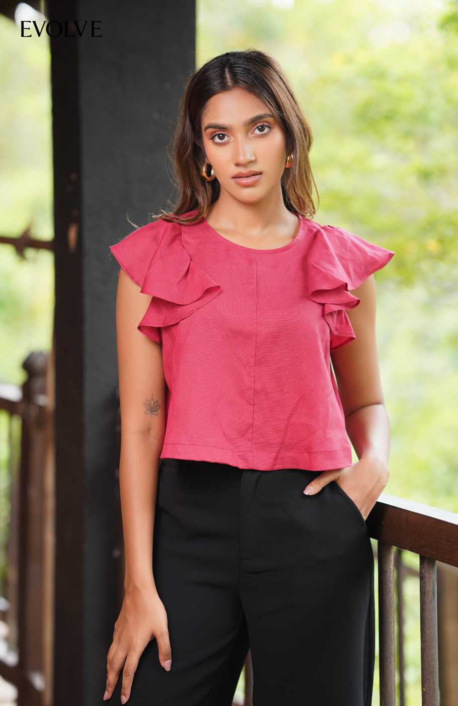 Ruffle sleeve crop top in breathable linen. Designed to keep you cool and comfortable all day. With soft feminine details and elegant ethnic touch.