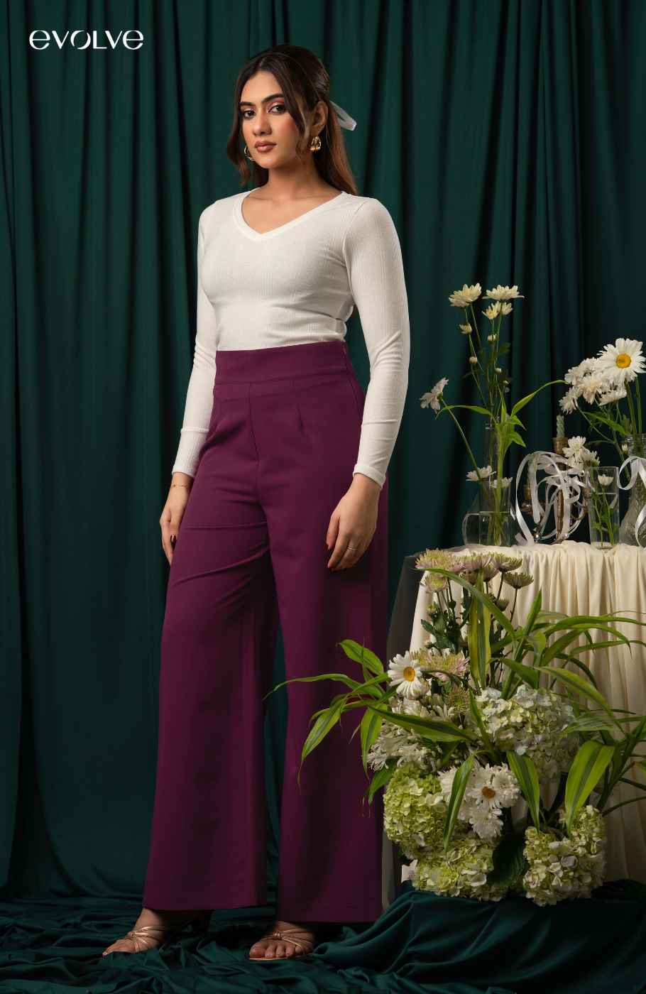 Have all the confidence you need with the EVOLVE High-Waisted Cairo Pants! Lightweight woven fabric shapes a boss-babe, high banded waist with a hidden side zip. Wide pant legs fall to ankle.Pant length - 42"Fabrication - 95% POLYESTER 5% SPANDEX