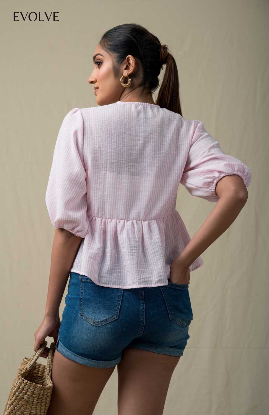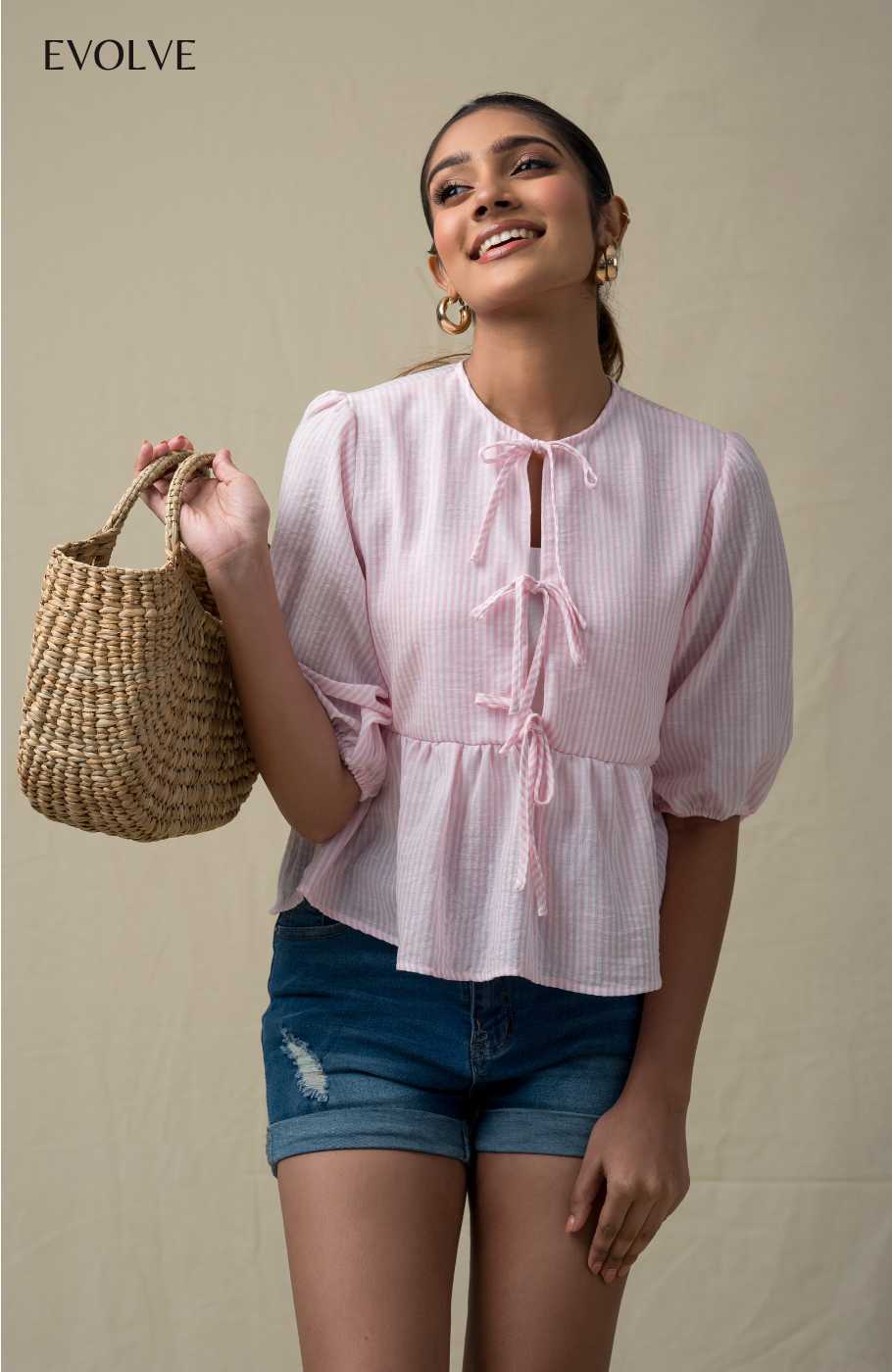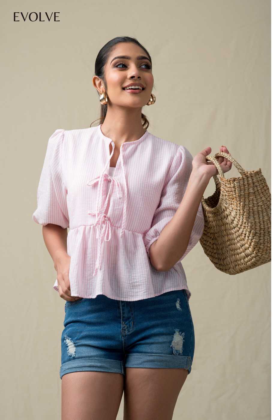 Show off your sweet side in the Delta ,short Sleeve Top! Crisp, lightweight woven linen shapes this perfectly adorable top that has puff style sleeves (with elastic at the cuffs) with front tie detail . Fabric - 100% Cotton