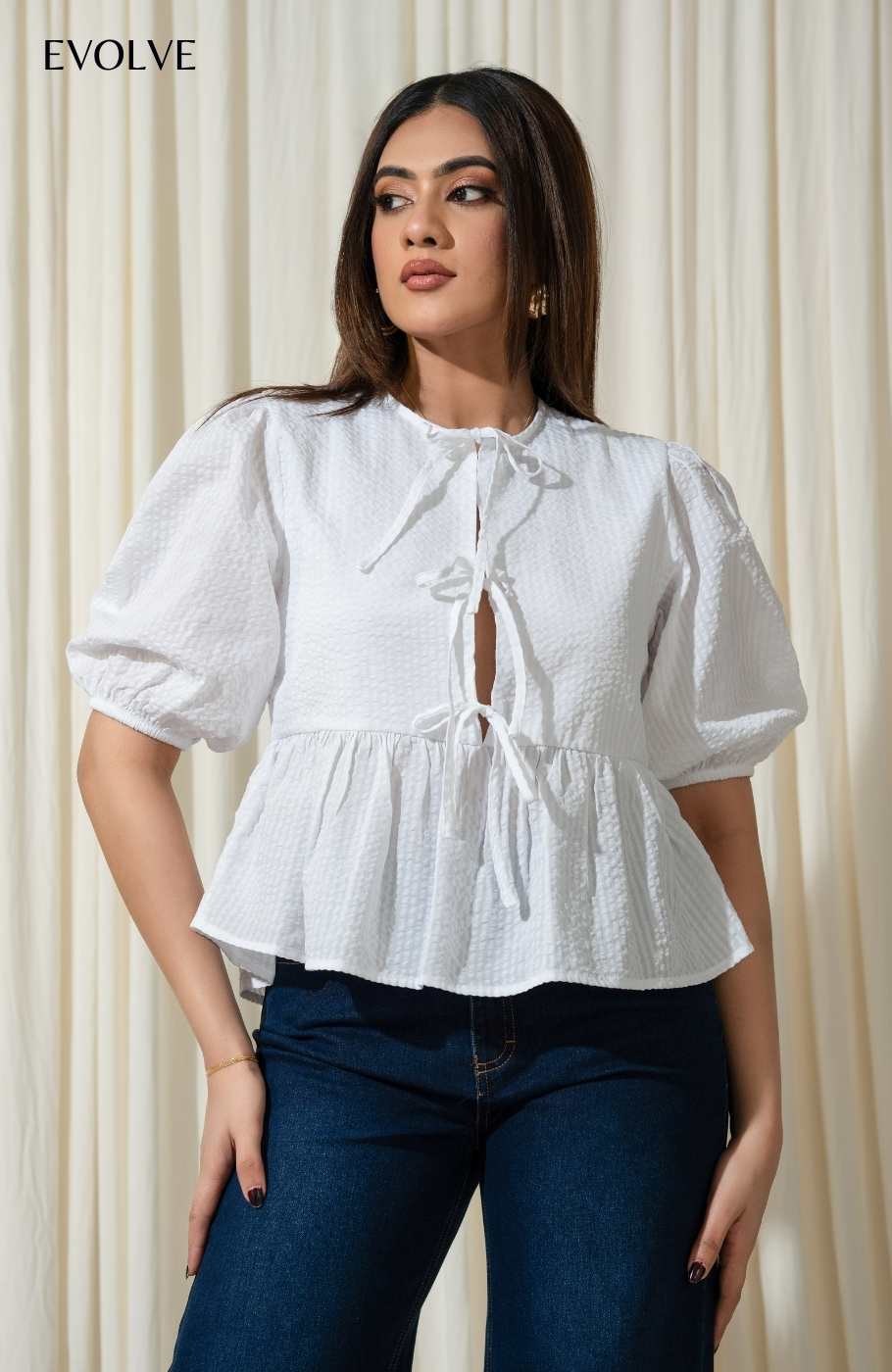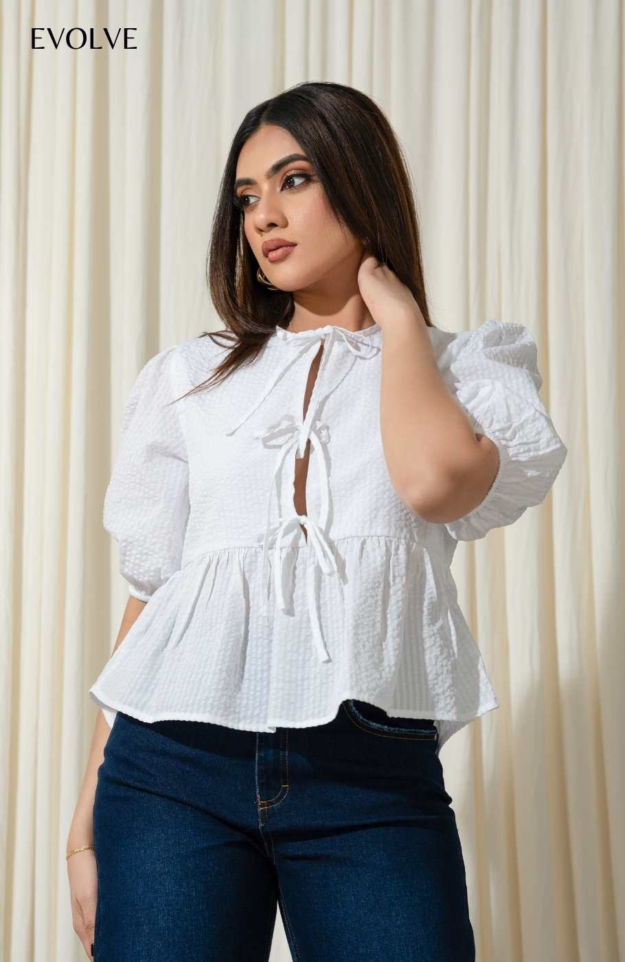 Show off your sweet side in the Delta ,short Sleeve Top! Crisp, lightweight woven linen shapes this perfectly adorable top that has puff style sleeves (with elastic at the cuffs) with front tie detail . Fabric - 100% Cotton