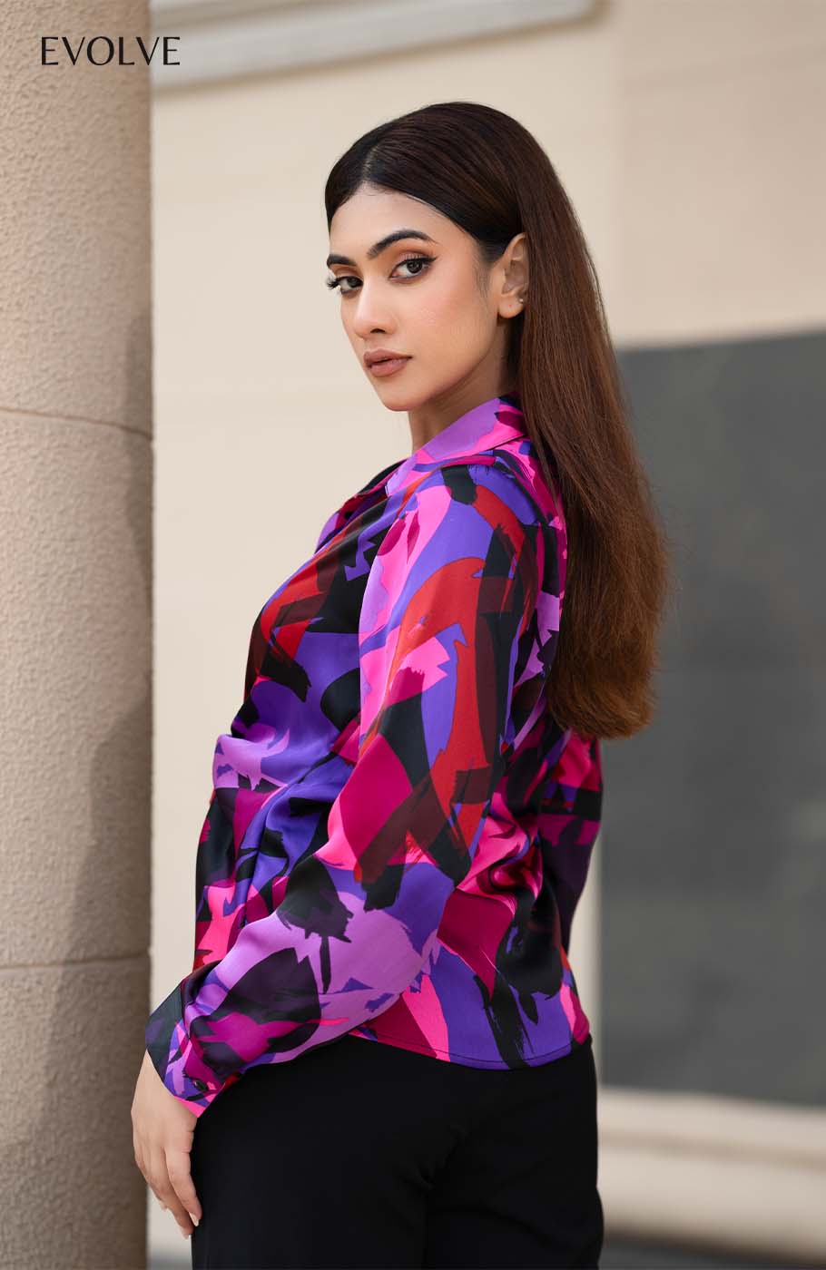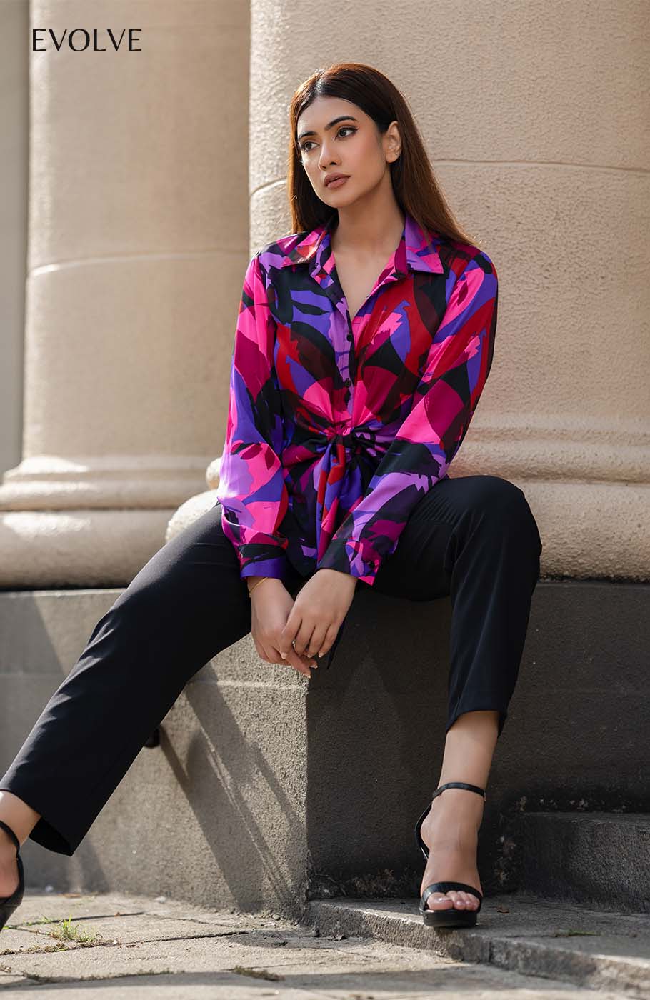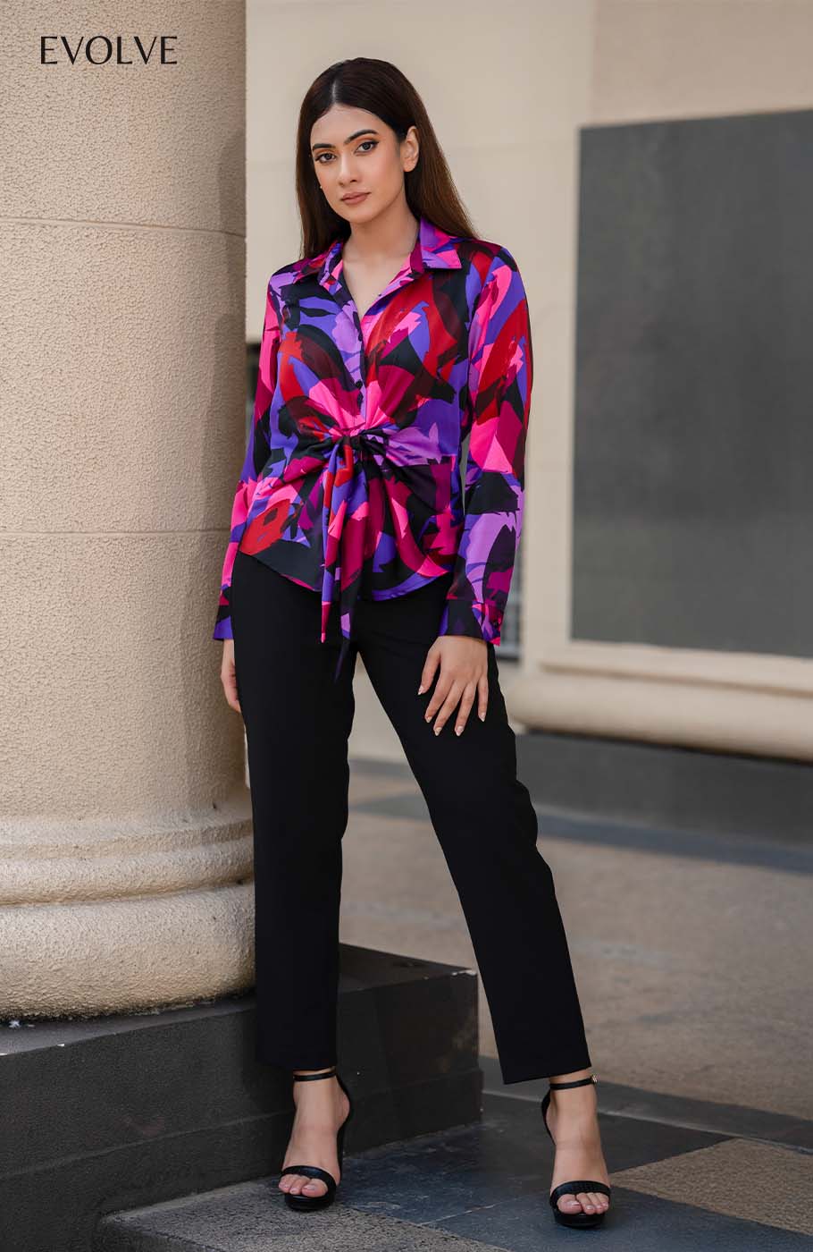 An elegant dressy shirt featuring a chic tie-up detail that adds a touch of sophistication. Perfect for both work and evening occasions, this versatile top combines refined style with effortless graceFabric - 100% Polyster