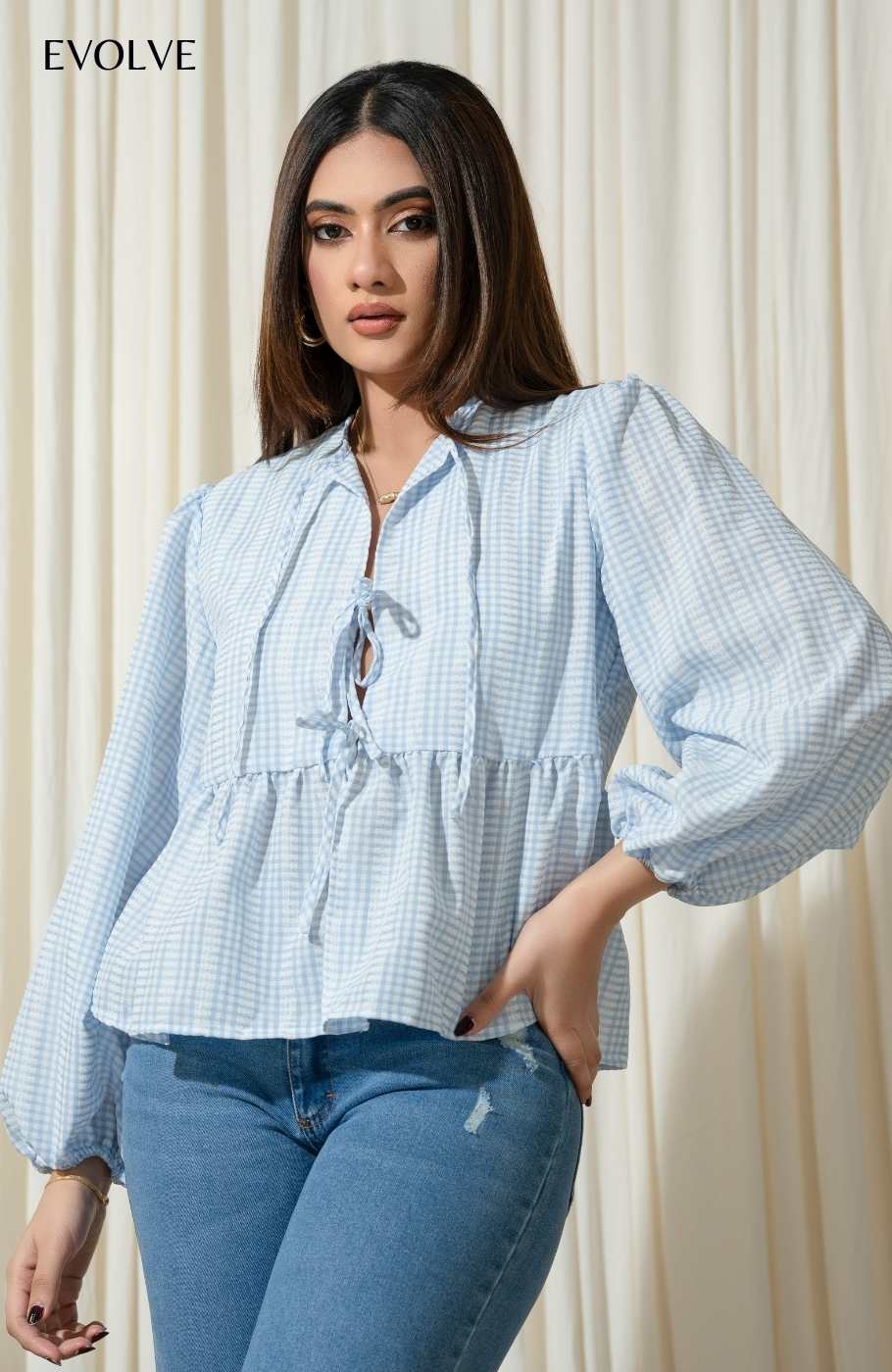 Show off your sweet side in the Evandra ,long Sleeve Top! Crisp, Gingham fabric shapes this perfectly adorable top that has puff style sleeves (with elastic at the cuffs) with front tie detail . Fabric - 100% Polyester
