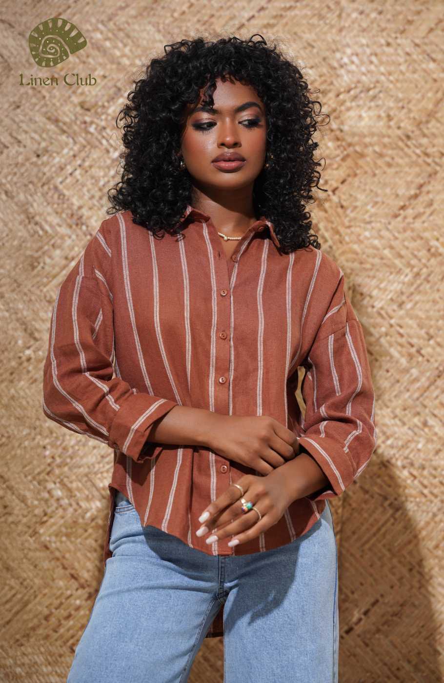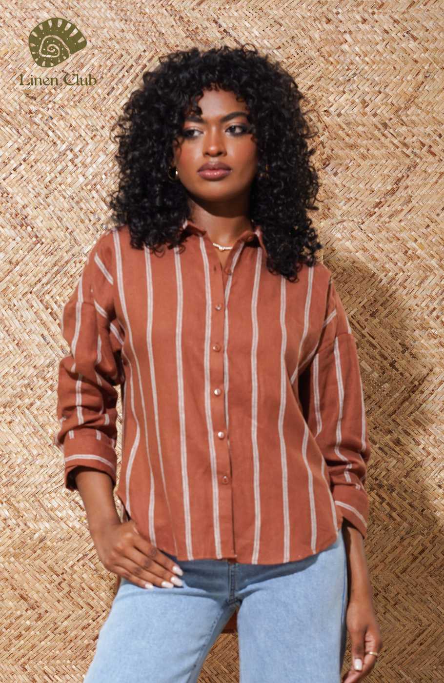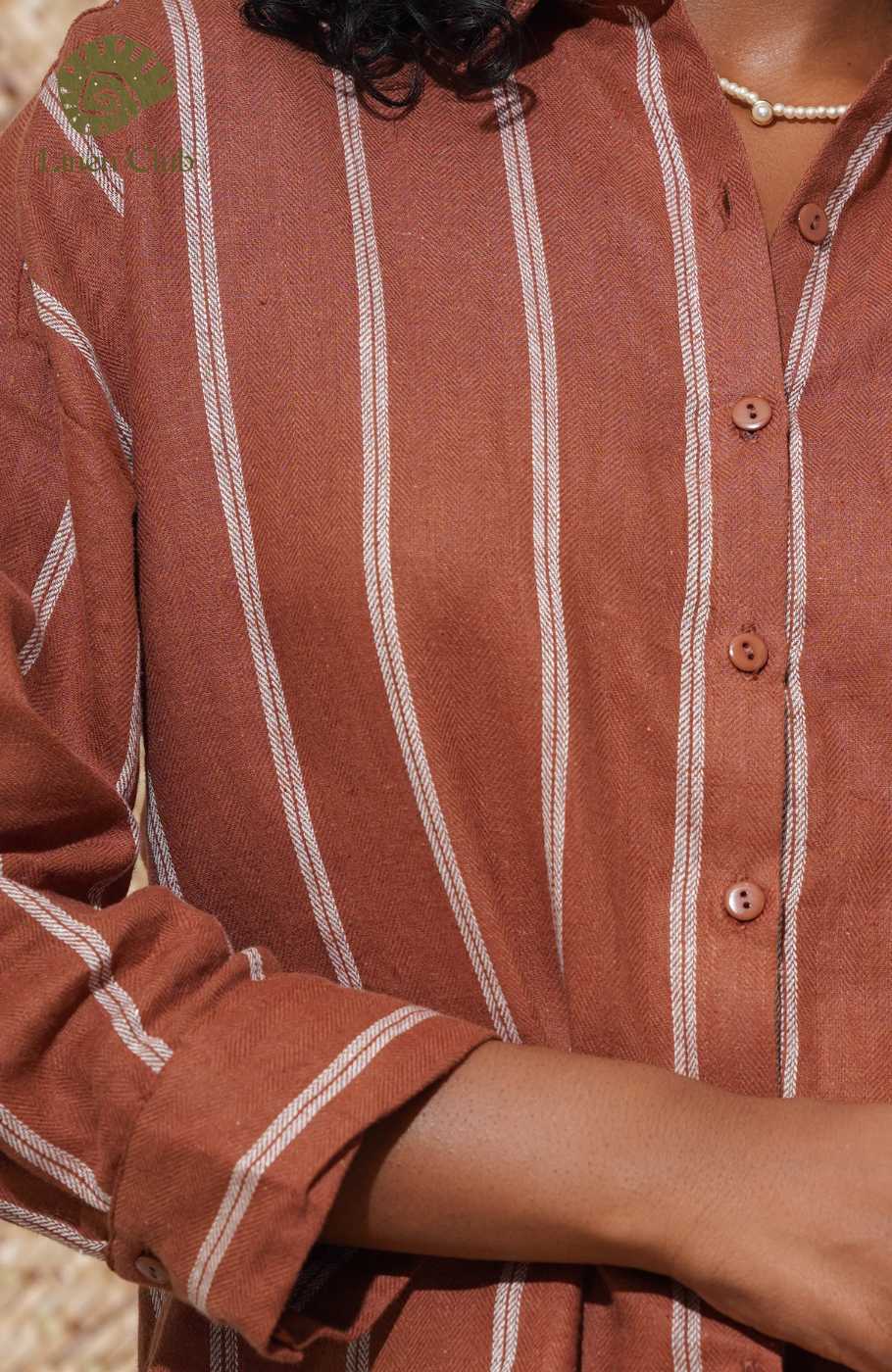 This breezy white shirt has tripes, collared neckline and long sleeves. Button Placket travel down the bodice.Fabric - 100% Linen