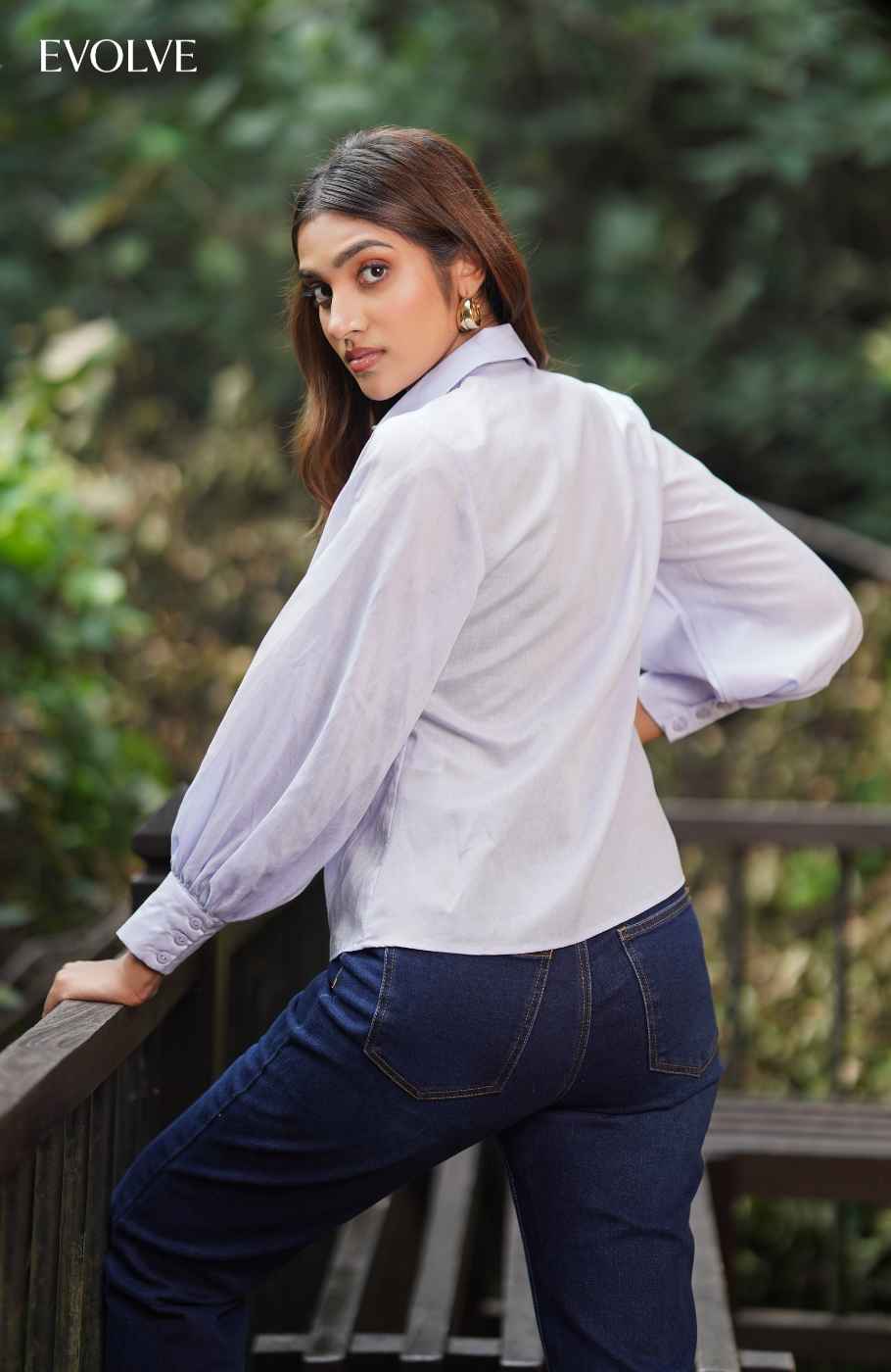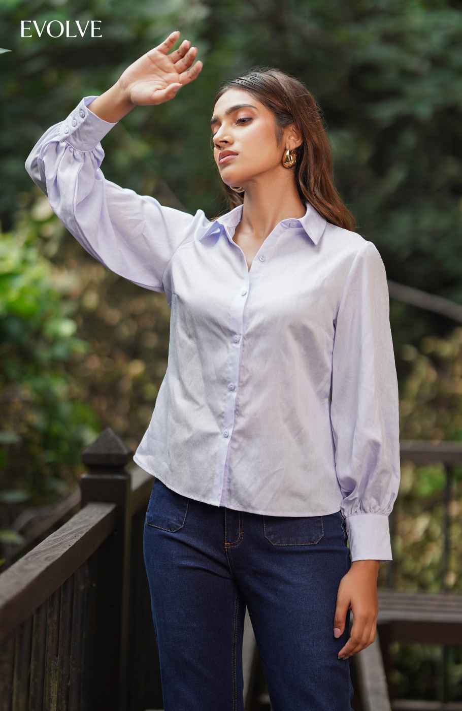 Lightweight woven fabric shapes this chic and simple top that has long balloon sleeves (with dramatic cuffs ) and a collared neckline. Functional button placket at front runs down to a full length hem that tucks perfectly into all your favorite skirts and pants!