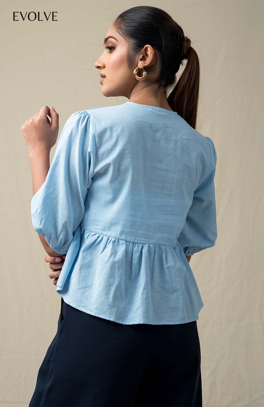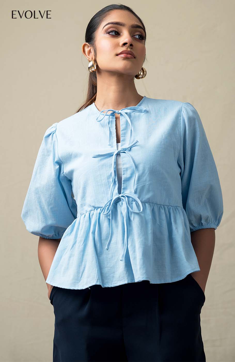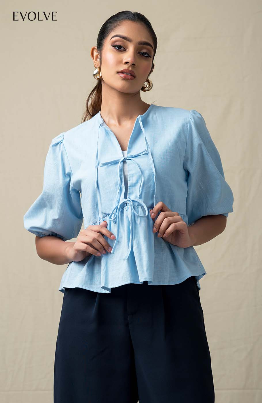 Show off your sweet side in the Delta ,short Sleeve Top! Crisp, lightweight woven linen shapes this perfectly adorable top that has puff style sleeves (with elastic at the cuffs) with front tie detail . Fabric - 100% Linen