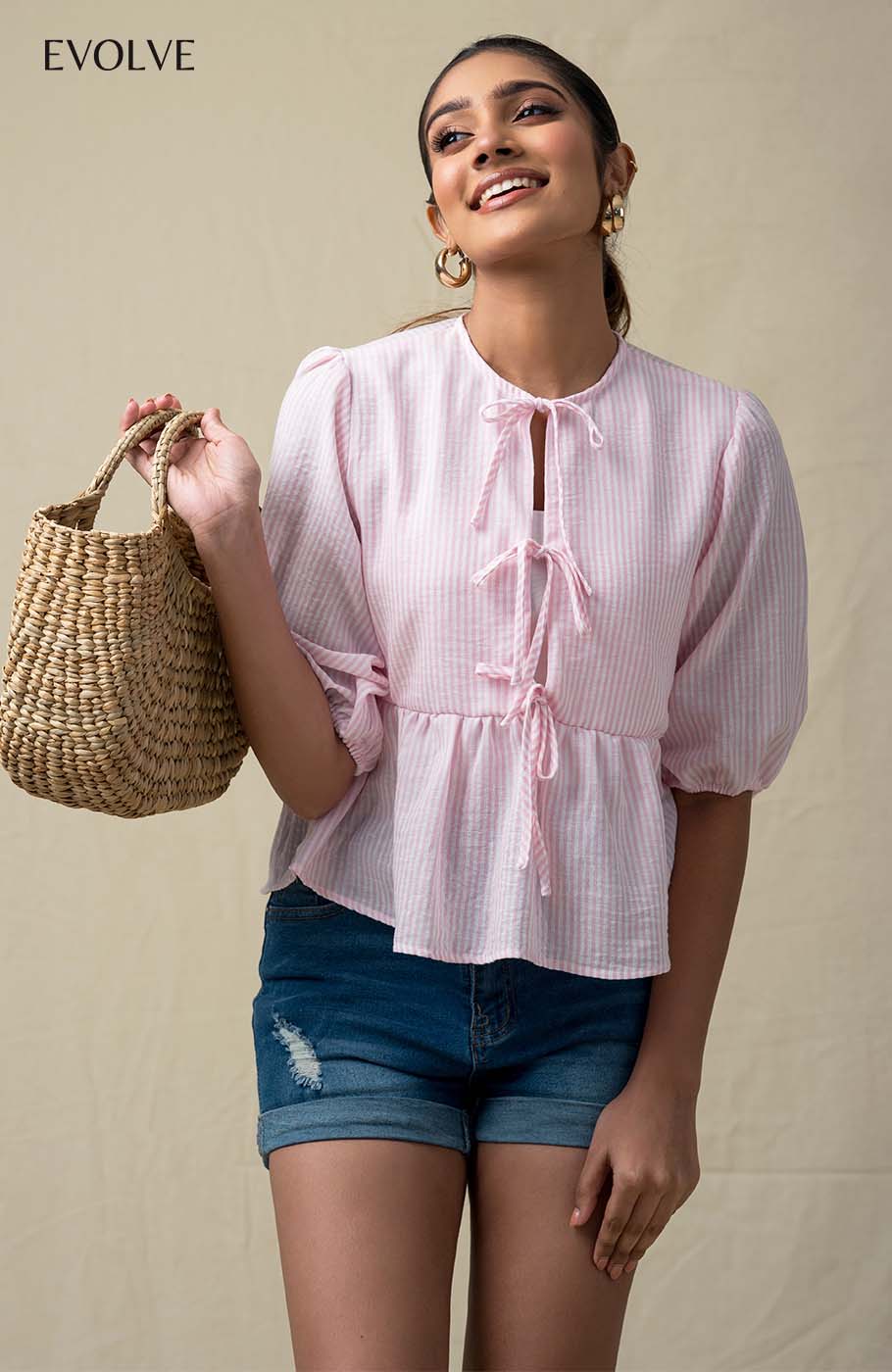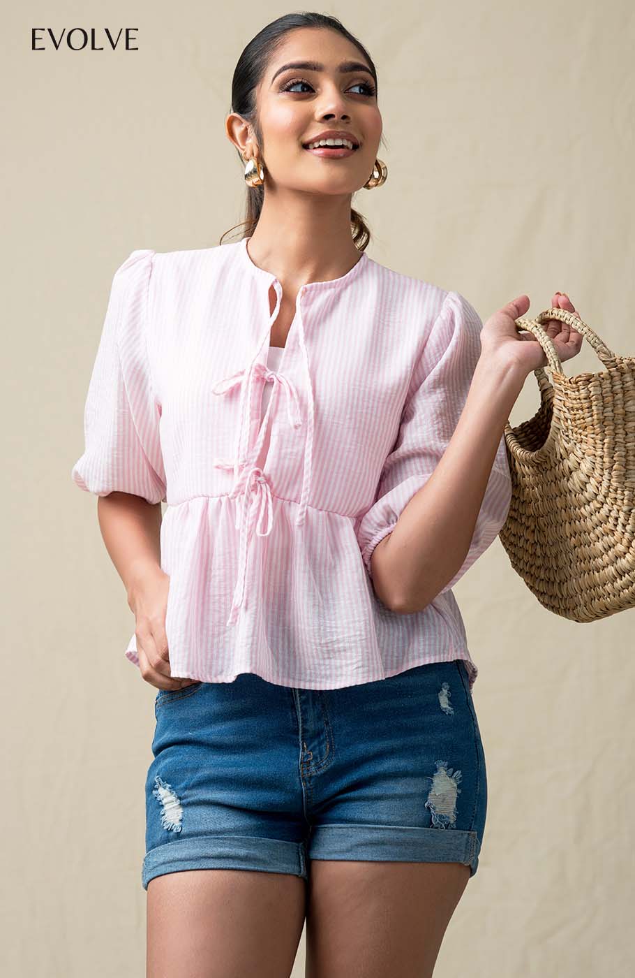 Show off your sweet side in the Delta ,short Sleeve Top! Crisp, lightweight woven linen shapes this perfectly adorable top that has puff style sleeves (with elastic at the cuffs) with front tie detail . Fabric - 100% Cotton