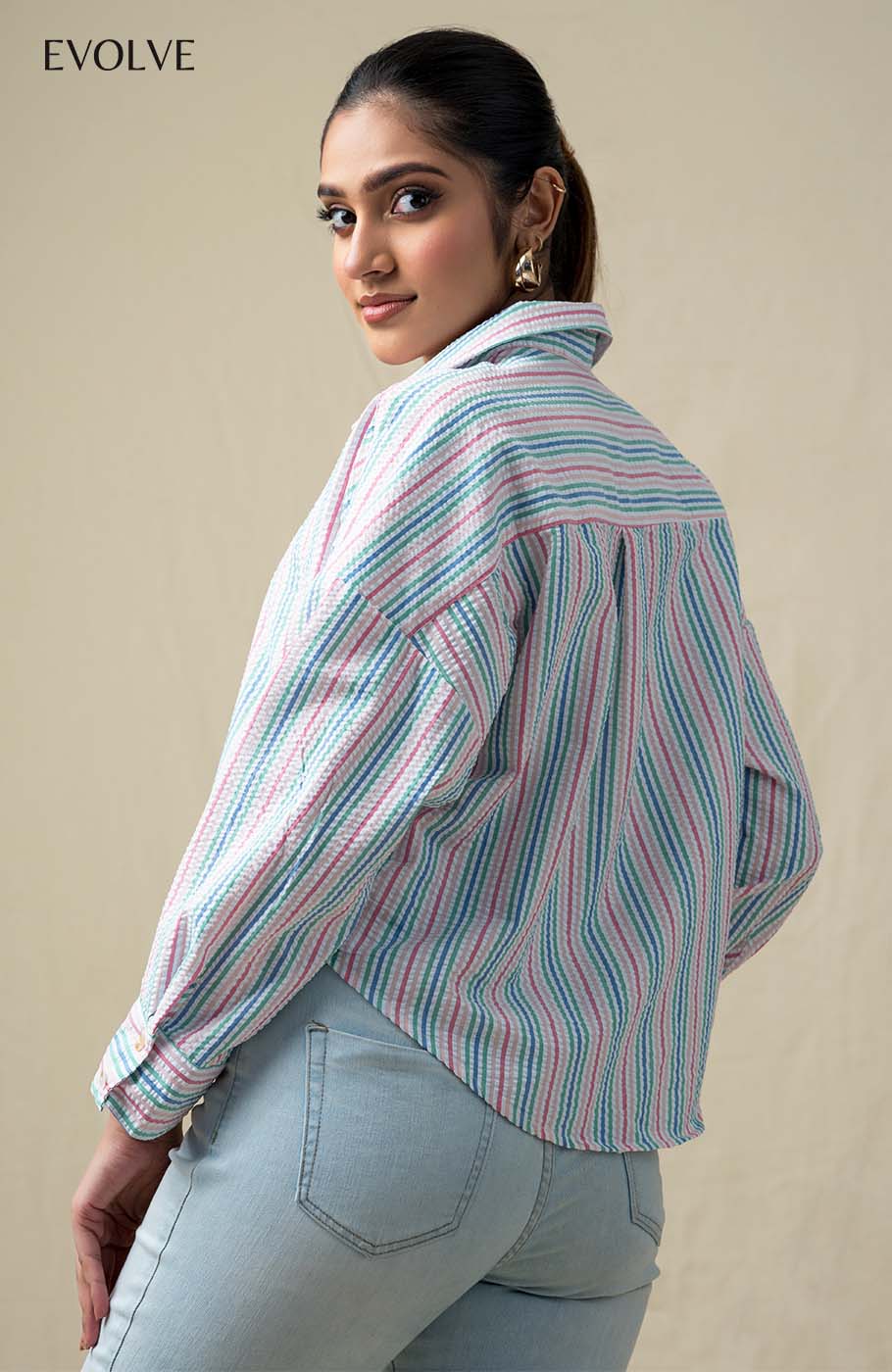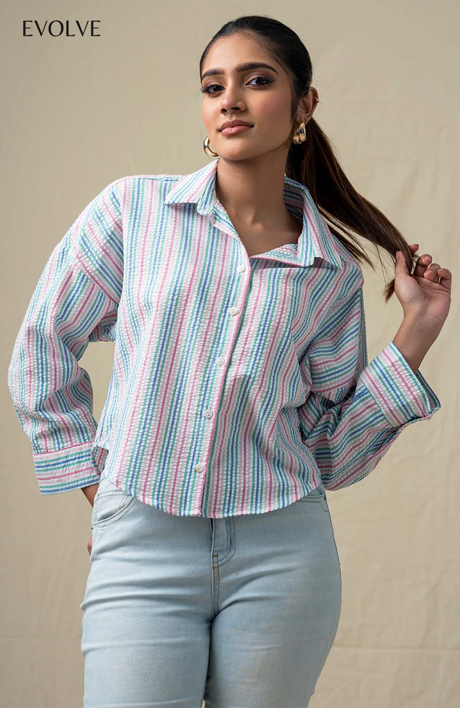 This breezy woven top has a stripe print, collared neckline, and long sleeves. Button placket travel down the cropped bodice.Over sized FitFabrication 100% cotton