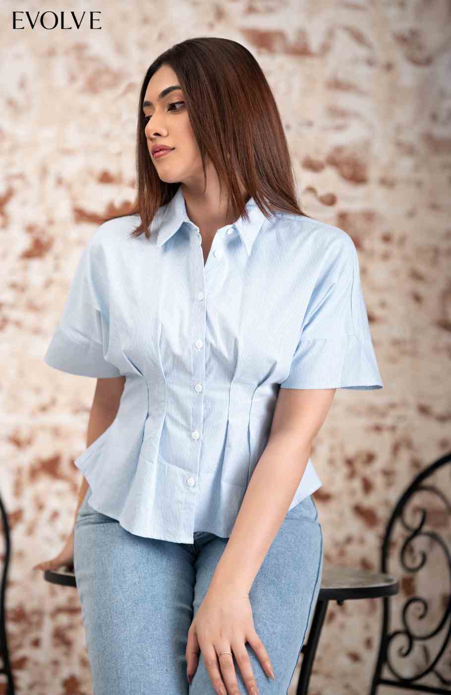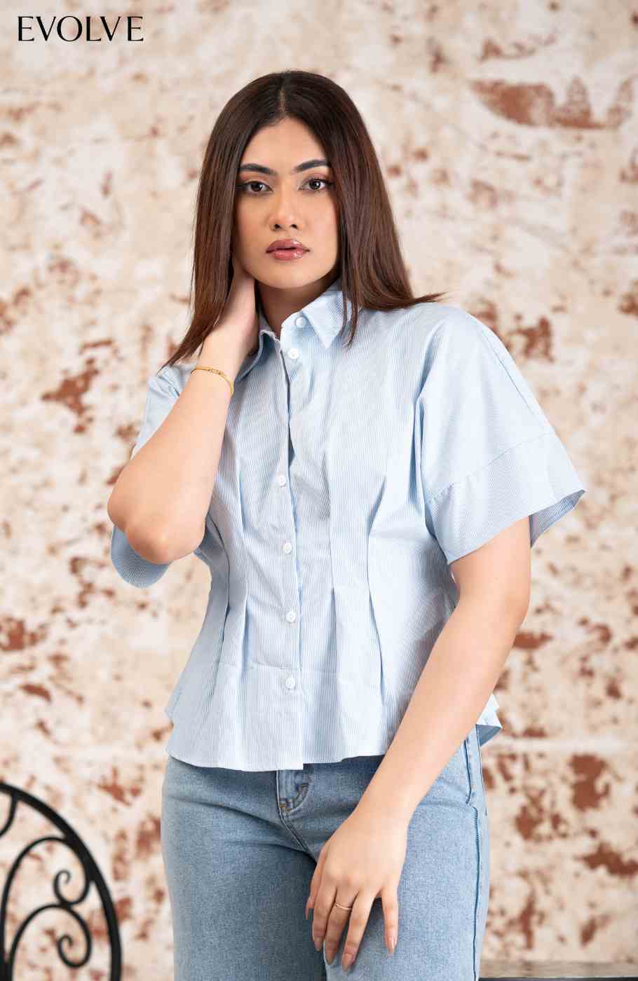 A refined essential for your everyday wardrobe — this bust-darted top is tailored for a clean, flattering fit. Designed with short sleeves and a structured silhouette, it blends comfort with sophistication, making it perfect for work or smart-casual settings.
