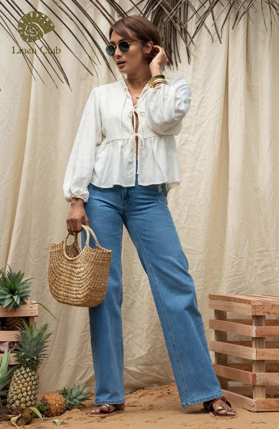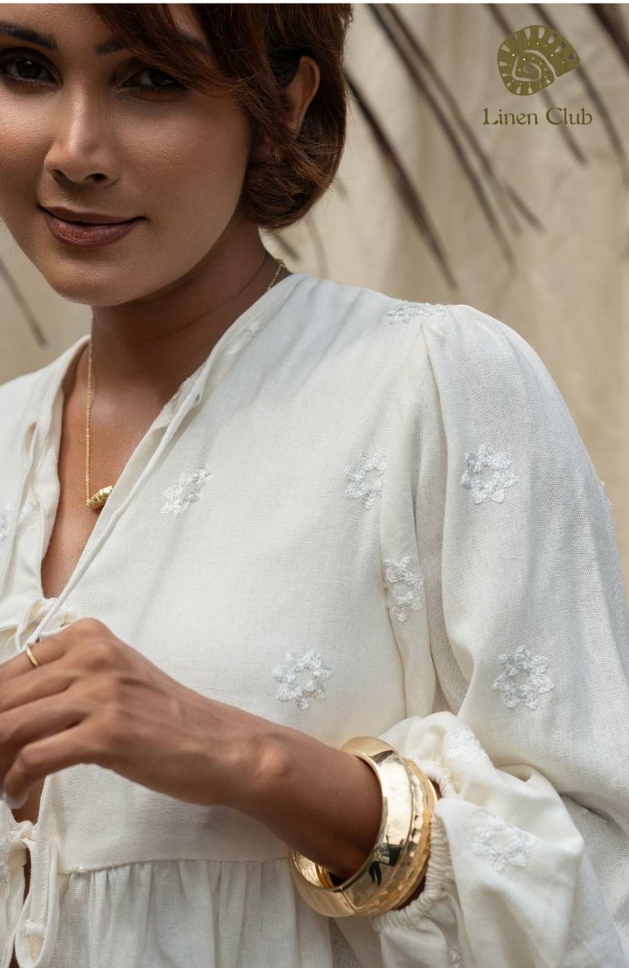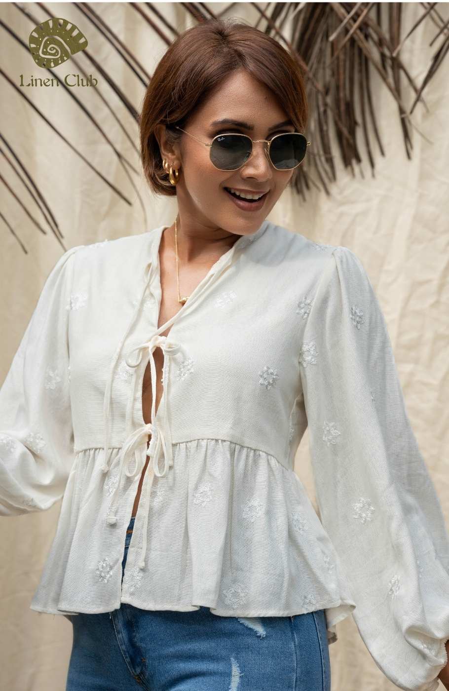 Show off your sweet side in the Evandra ,long Sleeve Top! Crisp, embroidered woven linen shapes this perfectly adorable top that has puff style sleeves (with elastic at the cuffs) with front tie detail . Fabric - 100% Linen