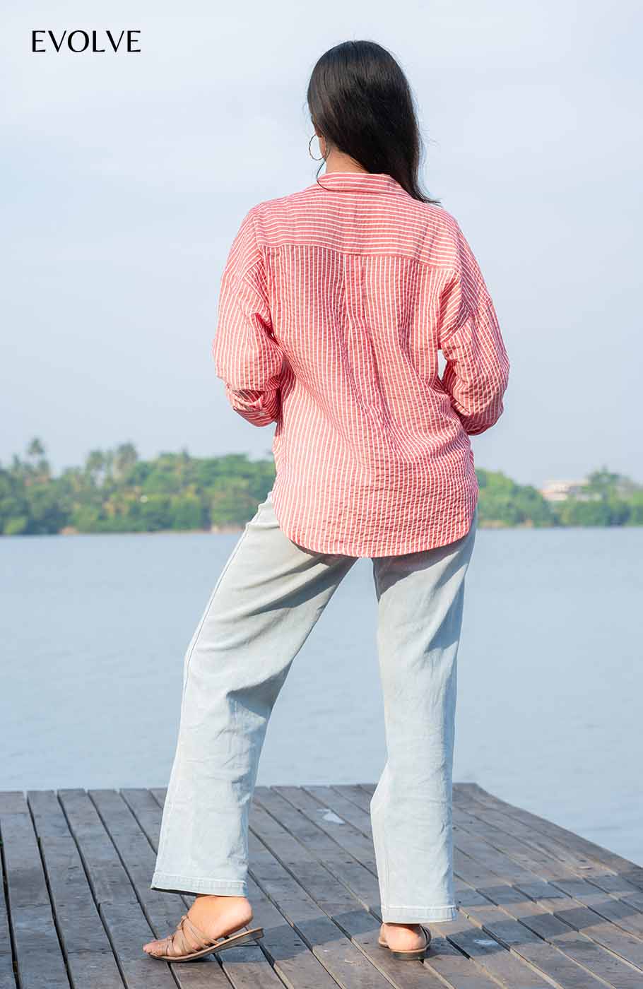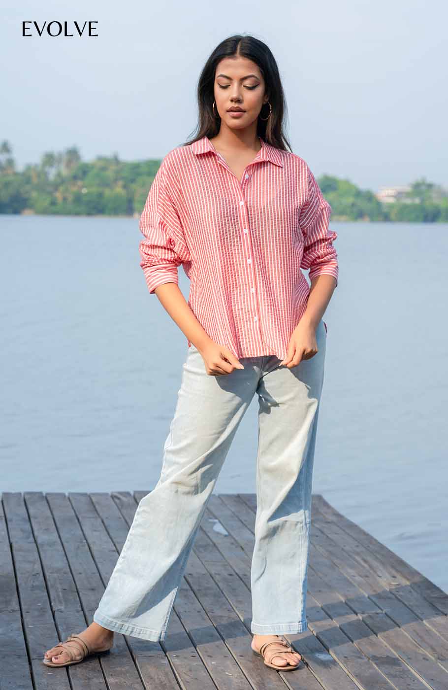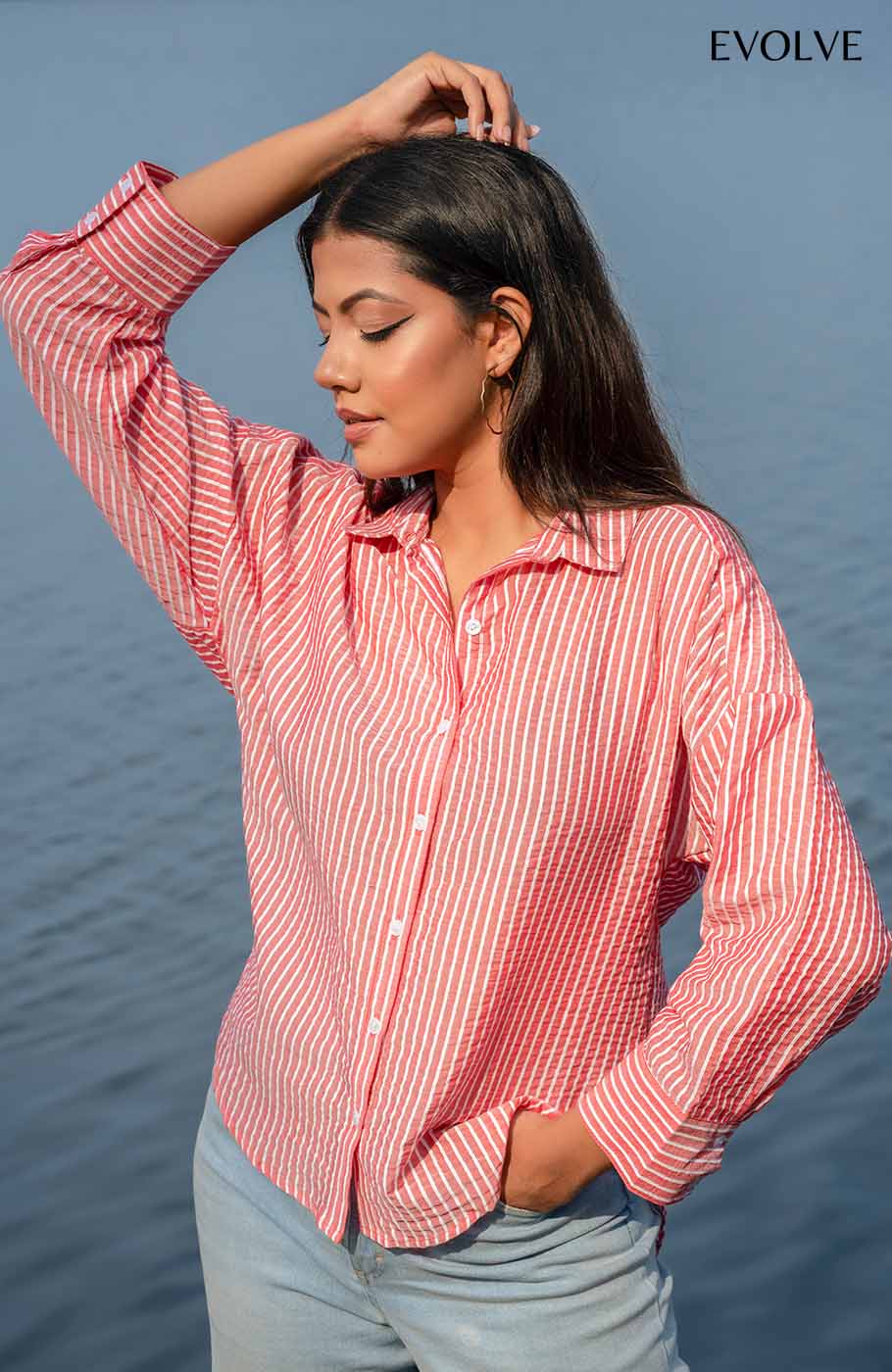 THIS BREEZY WOVEN TOP HAS A STRIPE PRINT, COLLARED NECKLINE, AND LONG SLEEVES. BUTTON PLACKET TRAVEL DOWN THE CURVE HEM1 BODICE.FABRICATION 100% COTTON